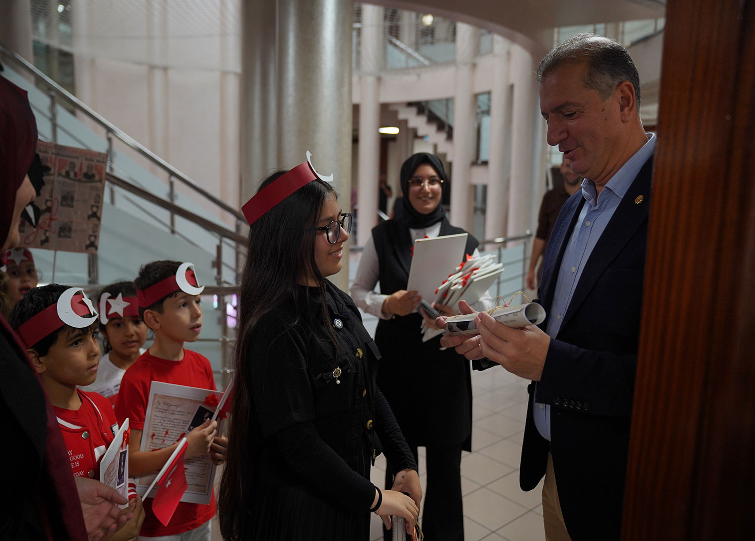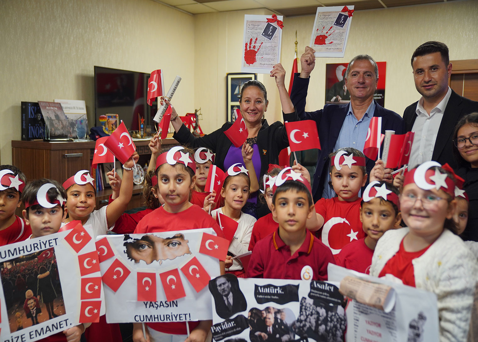 Etkinlikler sergiyle sınırlı kalmadı. Minik öğrenciler belediyedeki tüm müdürlükleri ziyaret ederek, Cumhuriyet Bayramı coşkusunu sloganlarla paylaştı ve çalışanlara el yapımı kartlar ile küçük hediyeler sundu.