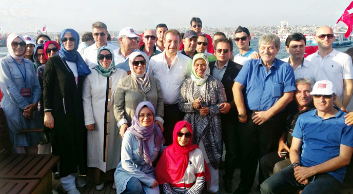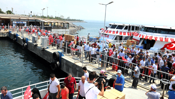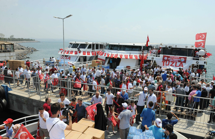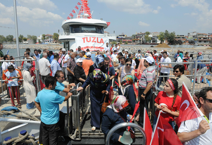 Tuzla Kaymakamı Ali Rıza Çalışır, Tuzla Belediye Başkanı Dr. Şadi Yazıcı ve eşi Dr. Fatma Yazıcı, AK Parti Tuzla İlçe Başkanı Sebahattin Demirci, kamu kurum ve kuruluşlarının yöneticileri ve vatandaşlar mitinge gemi ile ulaşım sağladı.