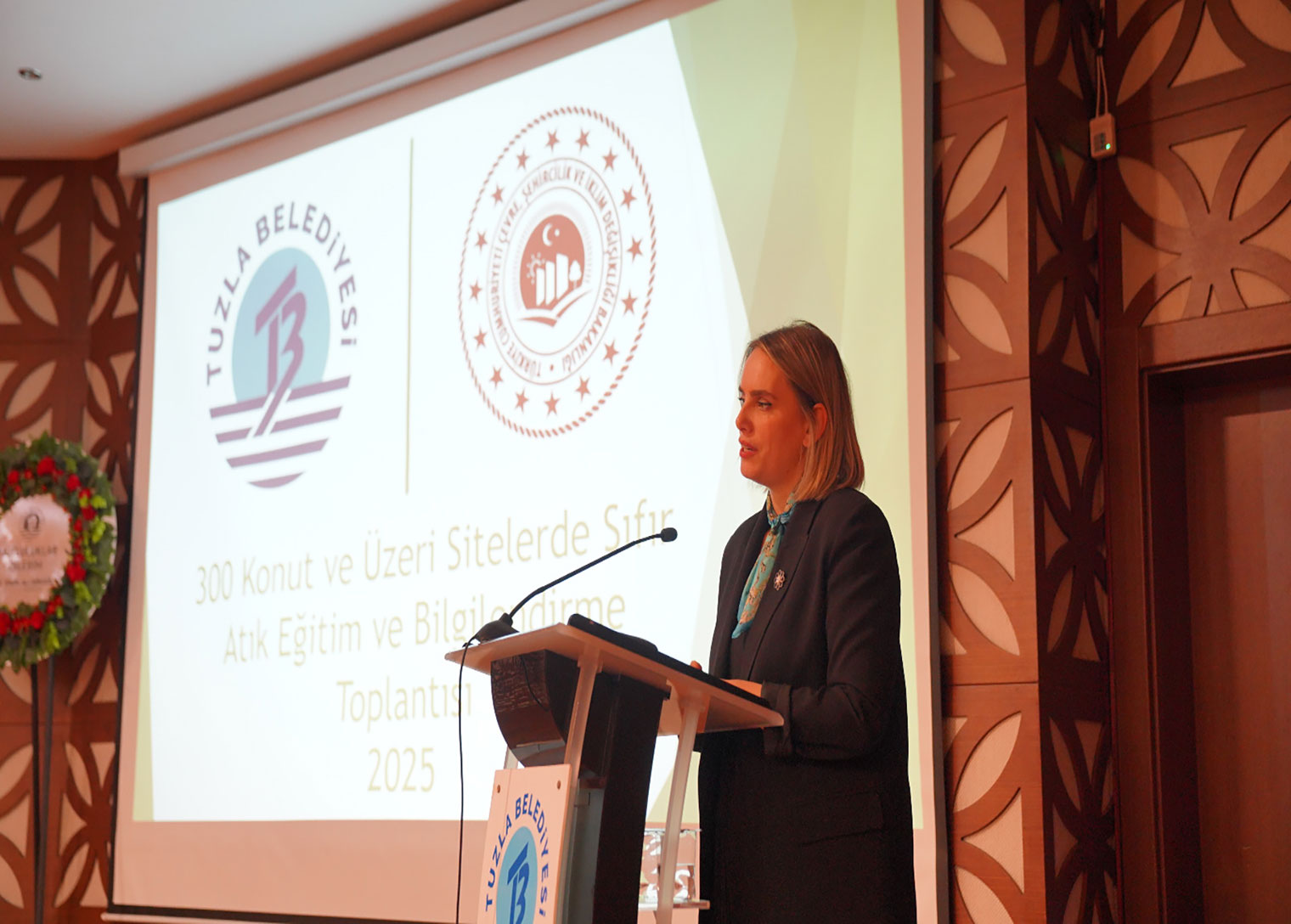 Toplantıda konuşan Tuzla Belediyesi İklim Değişikliği ve Sıfır Atık Müdürü Gökçe Çökmez, sıfır atık sisteminin sadece bir çevre uygulaması değil, aynı zamanda toplumsal bir bilinç hareketi olduğunu vurgulayarak şunları söyledi: